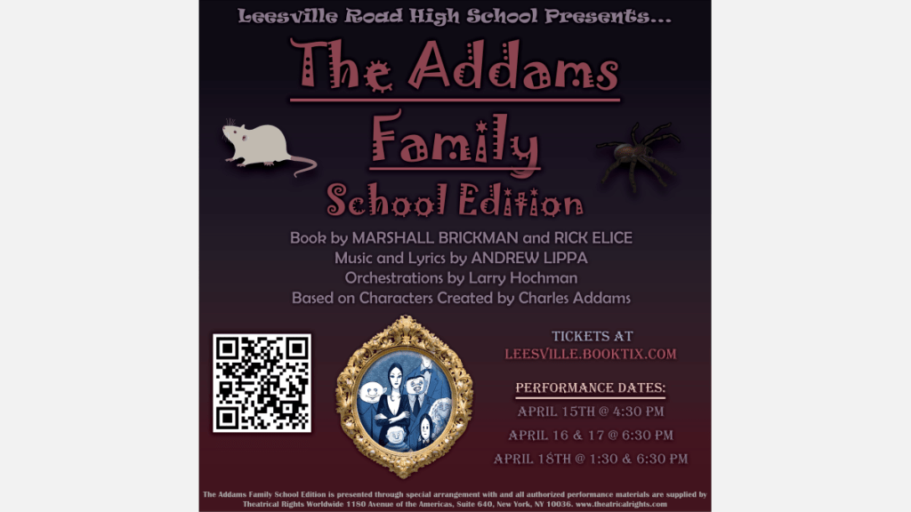I’m pleased to say that I am playing in the Pit Orchestra for the Leesville Road High School production of the hilarious musical, “The Addams Family“! Performances are from April 15-18.